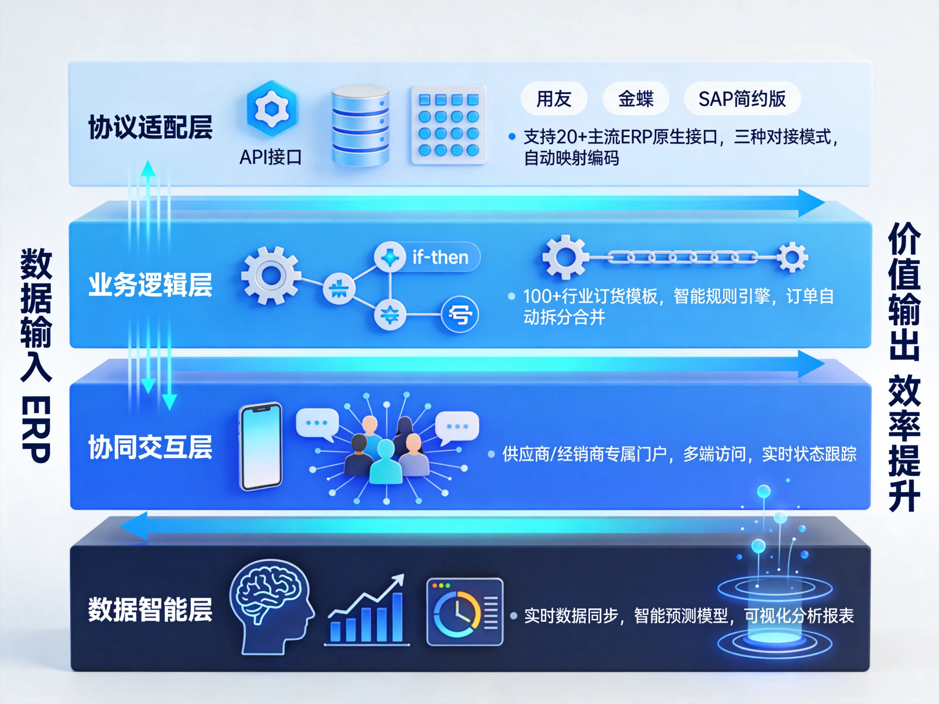 深圳云上互联科技有限公司研发的【云上订货】系统,创新性地提出四层架构技术方案,在ERP与企业间构建“柔性连接层”。这四层分别是: